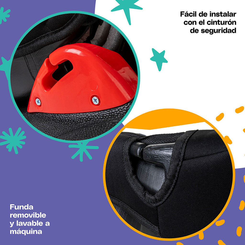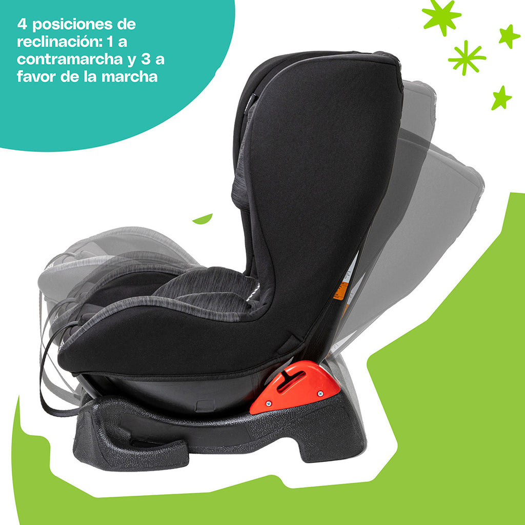 Almohadilla acolchada, 4 posiciones de reclinación, una a contramarcha y tres a favor de la marcha, que se ajustan a cada etapa de crecimiento. Es fácil de instalar utilizando el cinturón de seguridad del auto, y su funda removible y lavable a máquina facilita la limpieza.