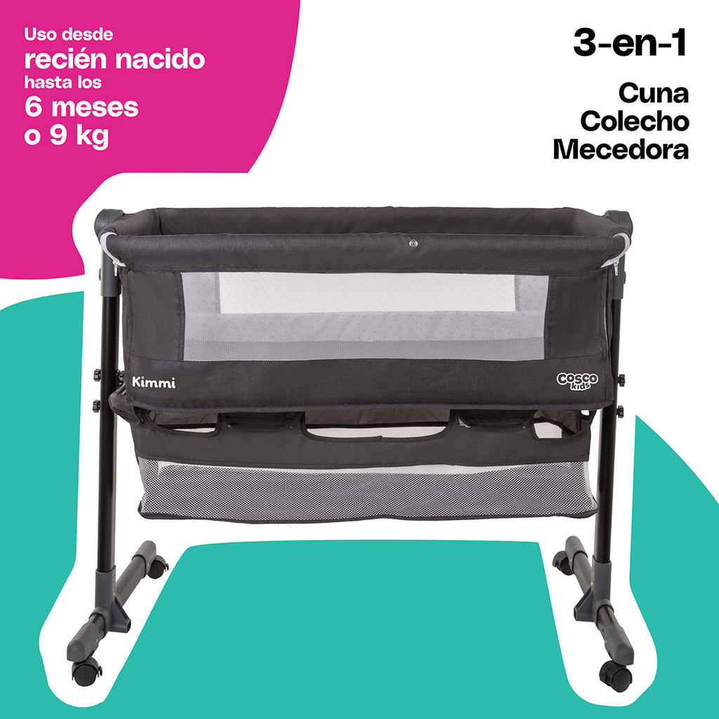 La cuna-colecho Kimmi 3-en-1 de Cosco Kids se recomienda usar desde recién nacido hasta los 6 meses o 9kg para que las noches sean más sencillas y seguras tanto para ti como para tu bebé. Es muy práctica, al tener una función mecedora, cuna y colecho para que tu pequeño se sienta tranquilo en todo momento. Brinda la mayor comodidad al dormir, ya que cuenta con una cómoda colchoneta, laterales acolchados y diferentes posiciones de reclinación para lograr la mejor calidad del descanso. Es muy fácil y segura de instalar por medio del sistema de anclaje y práctica apertura frontal. Se adapta fácilmente a la mayoría de las camas ya que cuenta con 3 niveles de altura ajustables. Además,tiene una canastilla de almacenamiento para tener todos los accesorios de tu bebé a la mano.
