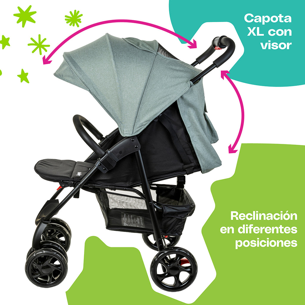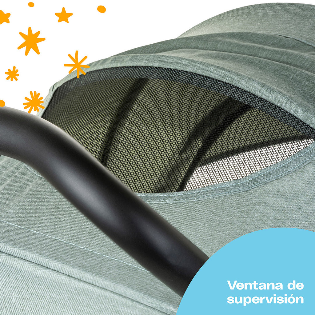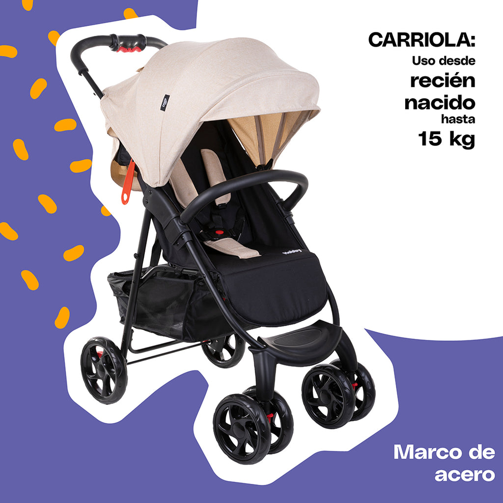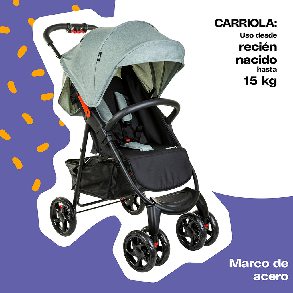 El portabebé cuenta con arnés de seguridad de 3 puntos y certificación R44, mientras que la carriola tiene un arnés de 5 puntos y una práctica ventana de supervisión para mantener siempre el contacto visual con tu bebé. Para mayor comodidad, cuenta con respaldo reclinable, reposapiés ajustable, protectores de hombros y un asa ergonómica en el portabebé. Tiene marco de acero y una capota XL con visor.