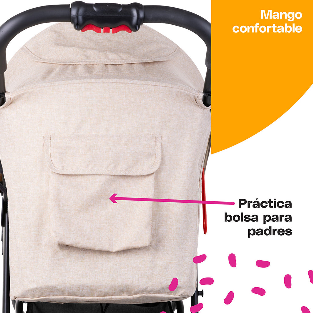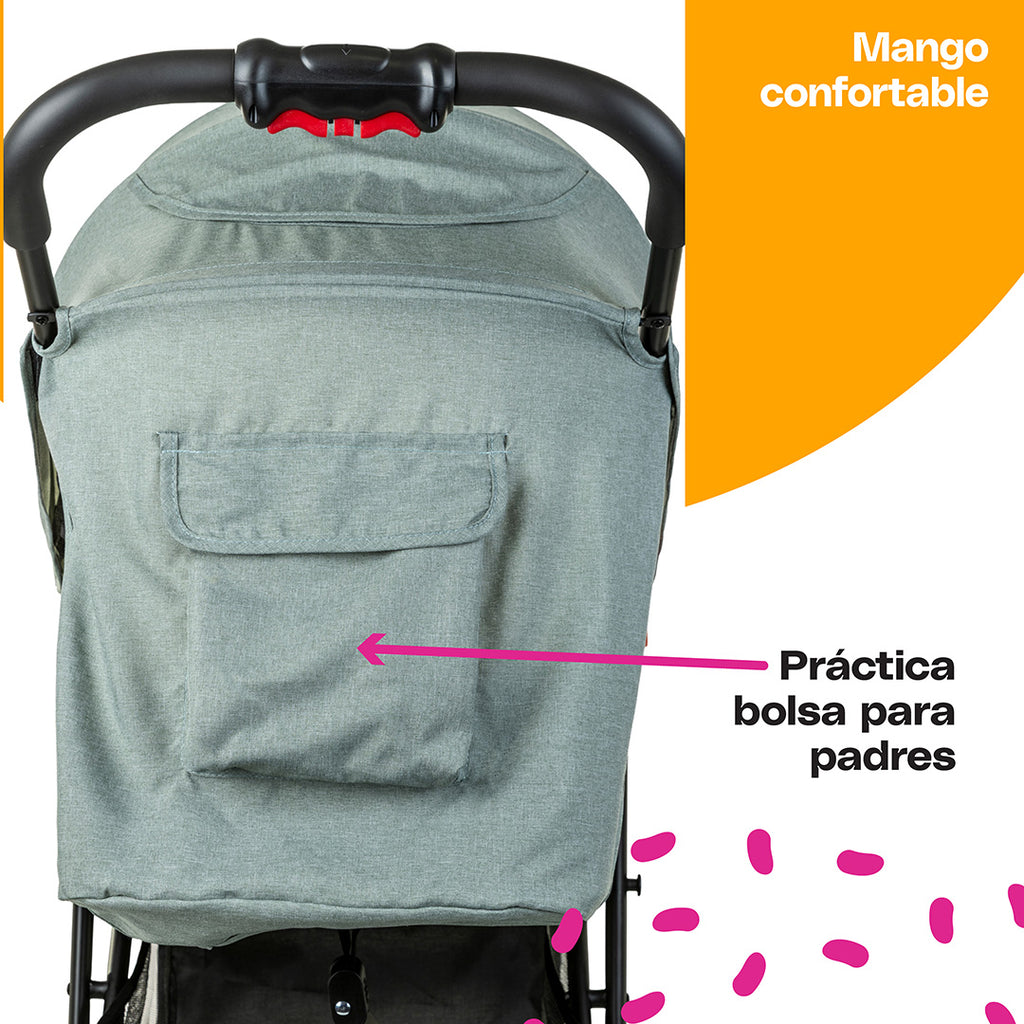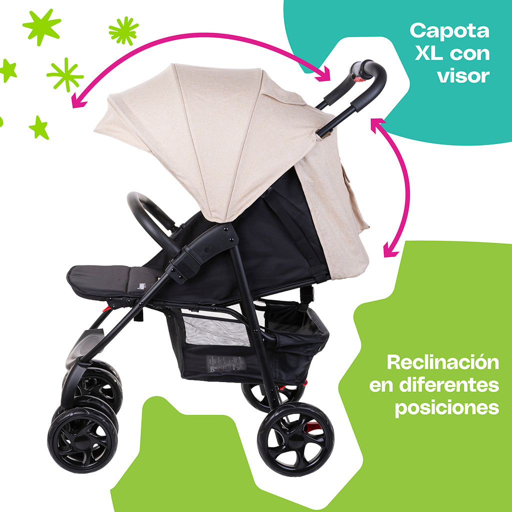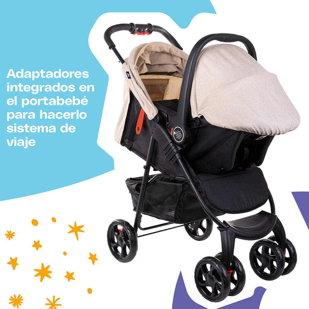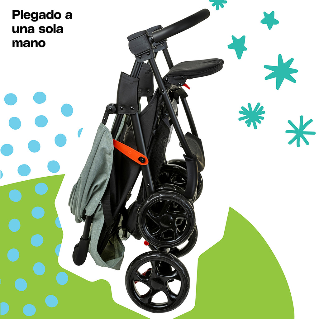 Ofrece un diseño práctico con una amplia canastilla de almacenamiento, adaptadores integrados que facilitan convertir el portabebé en sistema de viaje, con plegado a una sola mano. Sus llantas delanteras dobles con giro de 360° y bloqueo brindan una maniobrabilidad suave y precisa.